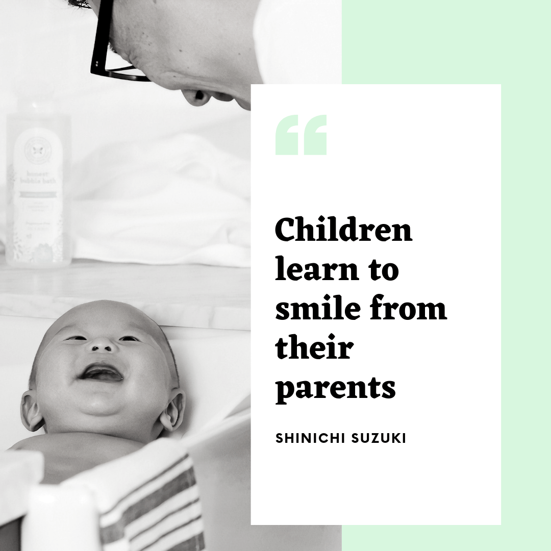 When Dr. Suzuki said that “children learn to smile from their parents,” it implies that smiling isn’t the only thing they are learning. Dictionary.com defines smile as to “form one’s features into a pleased, kind or amused expression, typically with the corners of the mouth turned up and the front of the teeth exposed.” Most of us know how to smile and how to identify when someone is smiling, but how did we learn to smile. We watched and observed those closest to us in those first few days at the beginning of our life. So Dr. Suzuki is implying with this statement that babies are learning at a lightening fast pace by observing and interacting with the humans closest to them and that those closest to them are teaching them. And that they may not realize they are teaching them! They are learning physical mannerisms, movement, facial expressions, tone of voice, even a locations accent or dialect. We are teaching things and we don’t even realize that we are teaching.